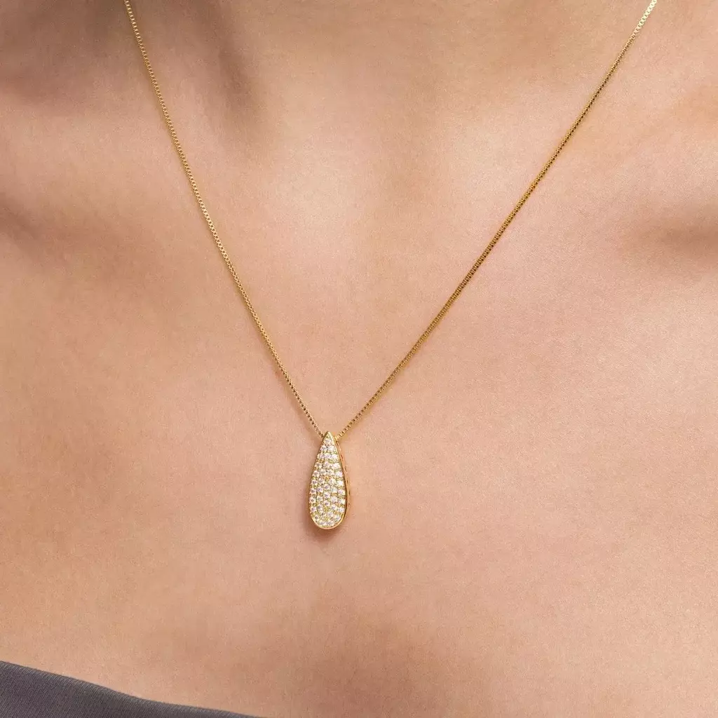 O Colar Georgia é a definição de delicadeza com impacto. Seu pingente em formato de gota, totalmente cravejado com microzircônias, cria um brilho contínuo e elegante, capaz de transformar qualquer produção com sutileza e presença.